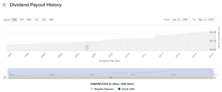 회사는 50 년의 운영 역사에서 584 개의 연속 주당 배당금을 선언했으며 1994 년 Realty Income의 상장 (NYSE : O) 이후 배당금을 100 배 늘렸다고 합니다.