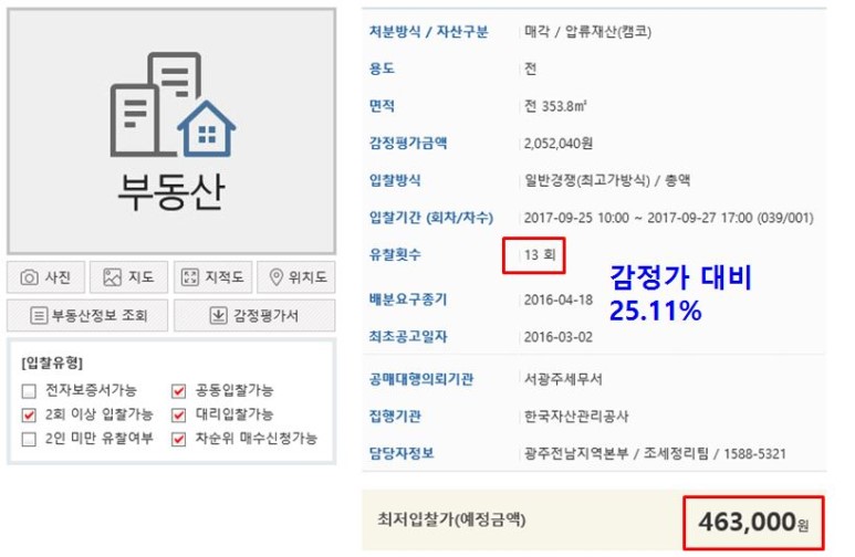 유찰 횟수가 무려 13회입니다. 감정가 대비 25% 할인 금액도 아주 저렴합니다..